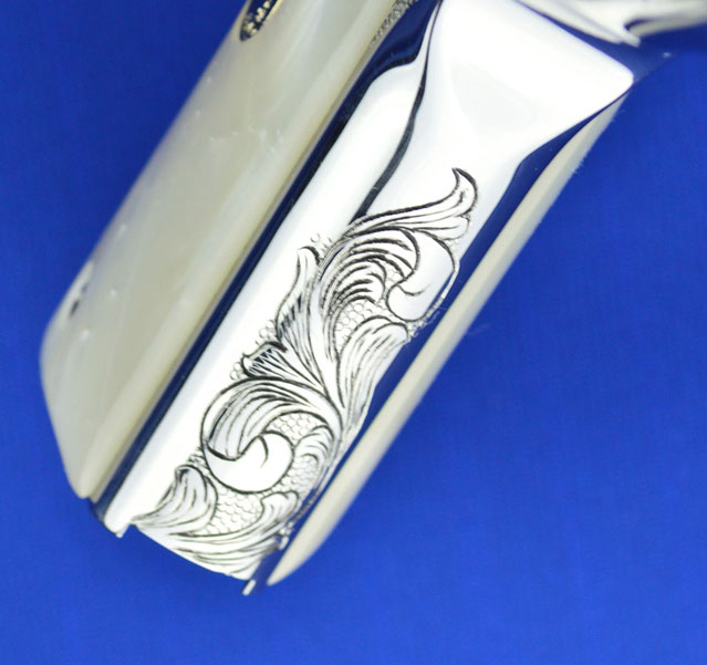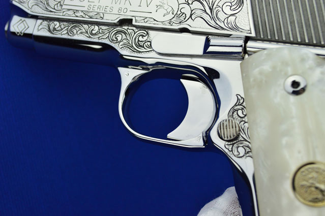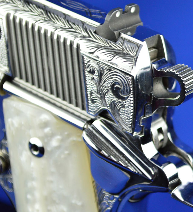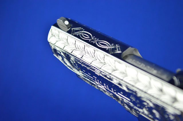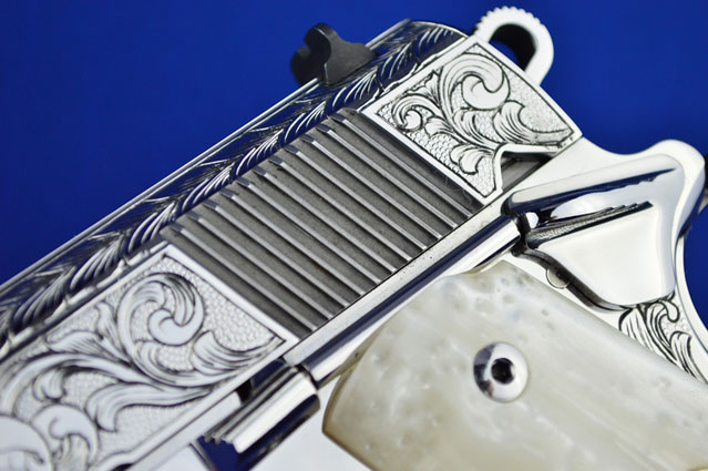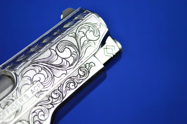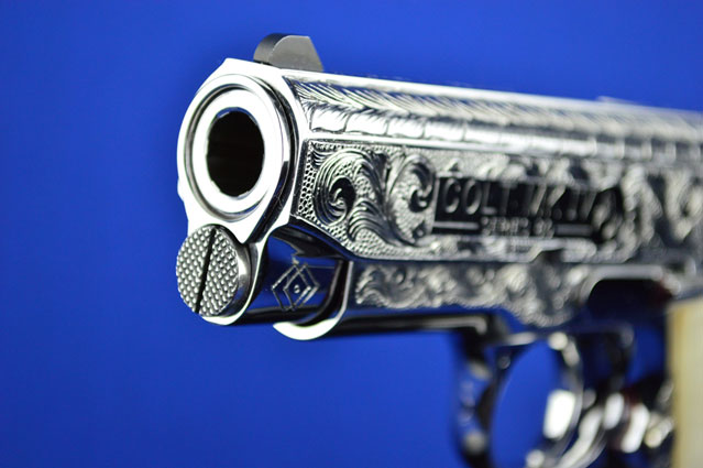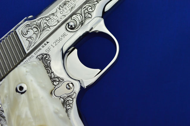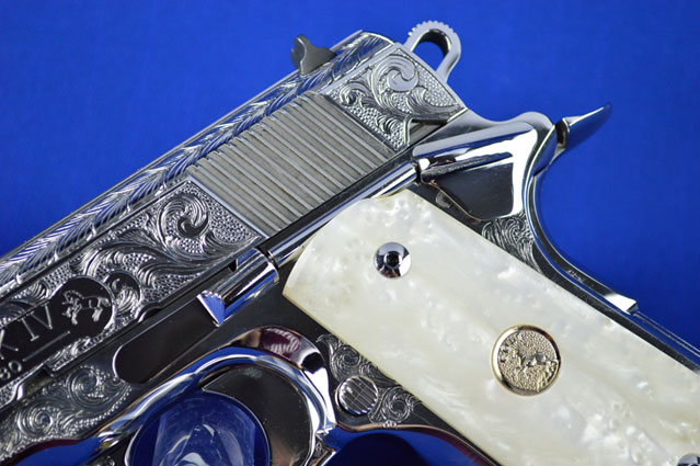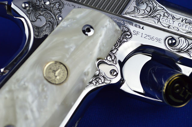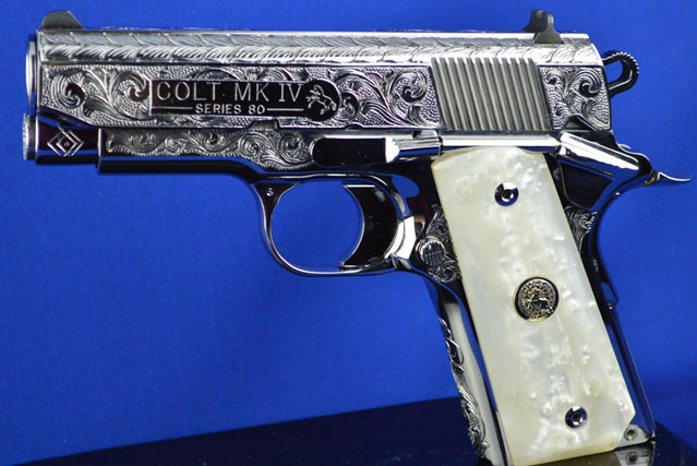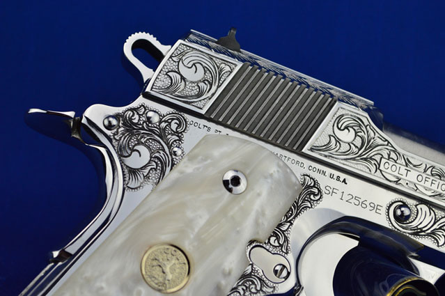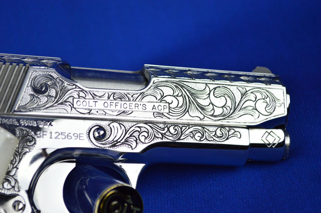 This is a Colt 1911 Officers sized pistol. The Colbert's requested a lot of coverage. Gerry used American Scroll, Running Leaf and Classic Colt Geometric Patterns do a tasteful pistol that still has alot of flash.