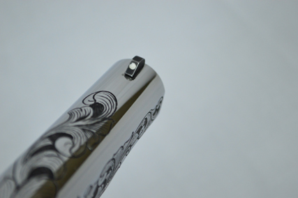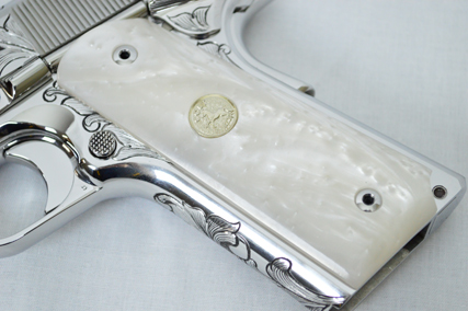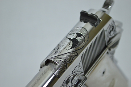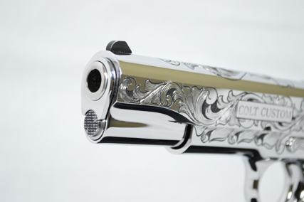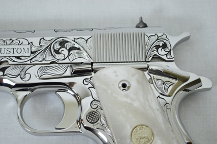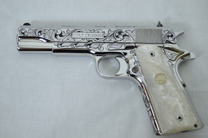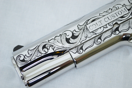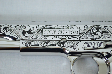 This is a Colt Custom 1911 .38 Super in Bright Stainless. The Colbert's requested a scroll pattern on this firearm that had both a relieved background and a very low budget. This is what Gerry can do with very few hours.