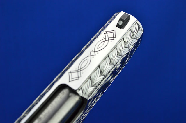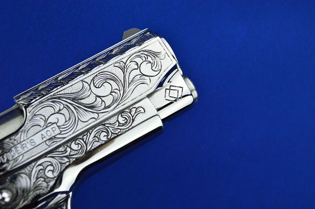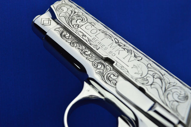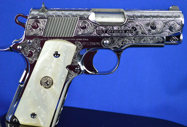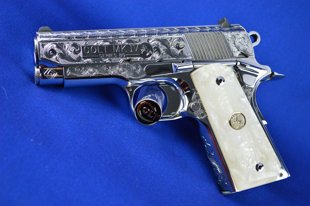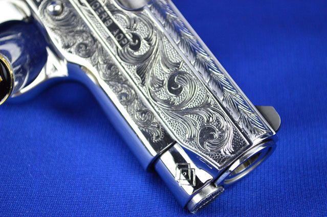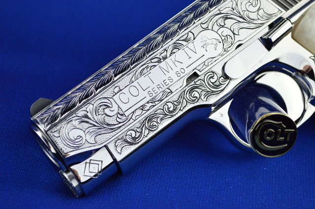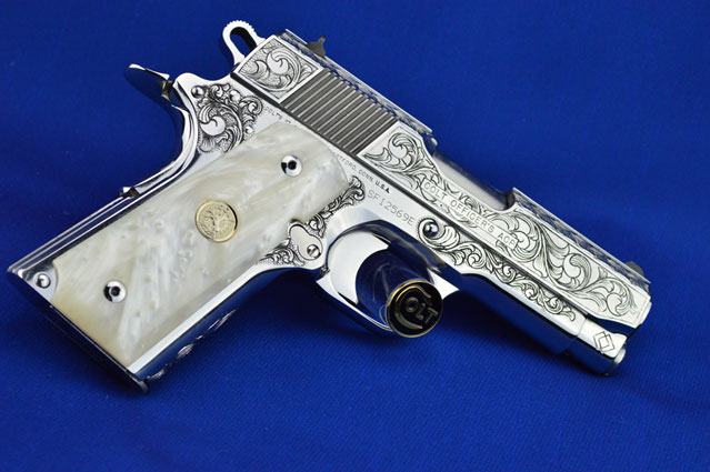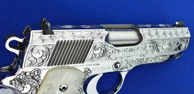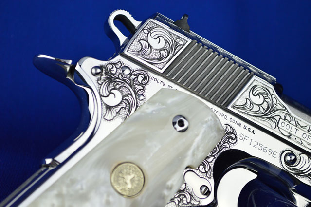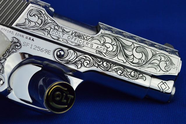 This is a Colt 1911 Officers sized pistol. The Colbert's requested a lot of coverage. Gerry used American Scroll, Running Leaf and Classic Colt Geometric Patterns do a tasteful pistol that still has alot of flash.