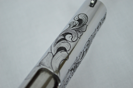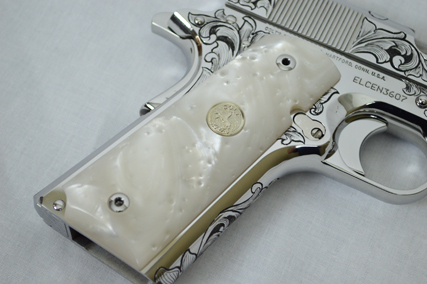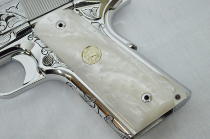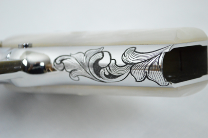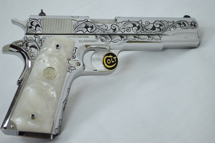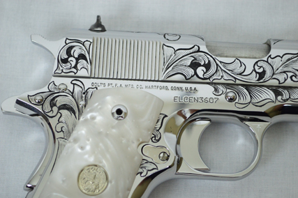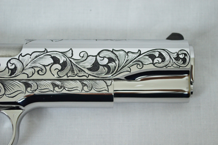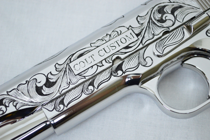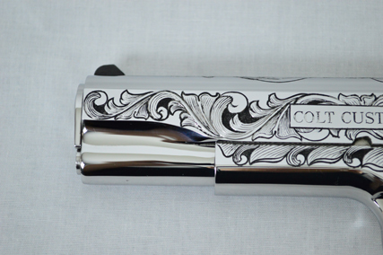 This is a Colt Custom 1911 .38 Super in Bright Stainless. The Colbert's requested a scroll pattern on this firearm that had both a relieved background and a very low budget. This is what Gerry can do with very few hours.